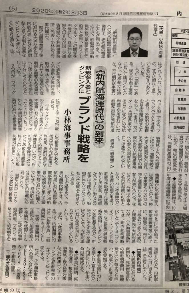 【内航海運新聞】の記事に掲載されました(8月3日付け)