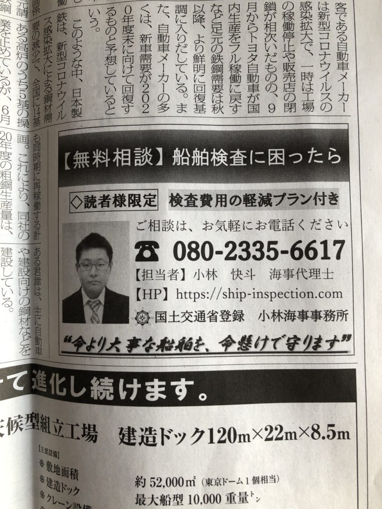 今回もご覧頂き、誠にありがとうございます。 大変お世話になっている【内航海運新聞】で小林海事事務所の連載記事『内航ナレッジ』第四弾と広告も同時に掲載されました! 内容としては「船舶検査」と「海事代理士」の見直しです。 海事代理士の見直し 海... -