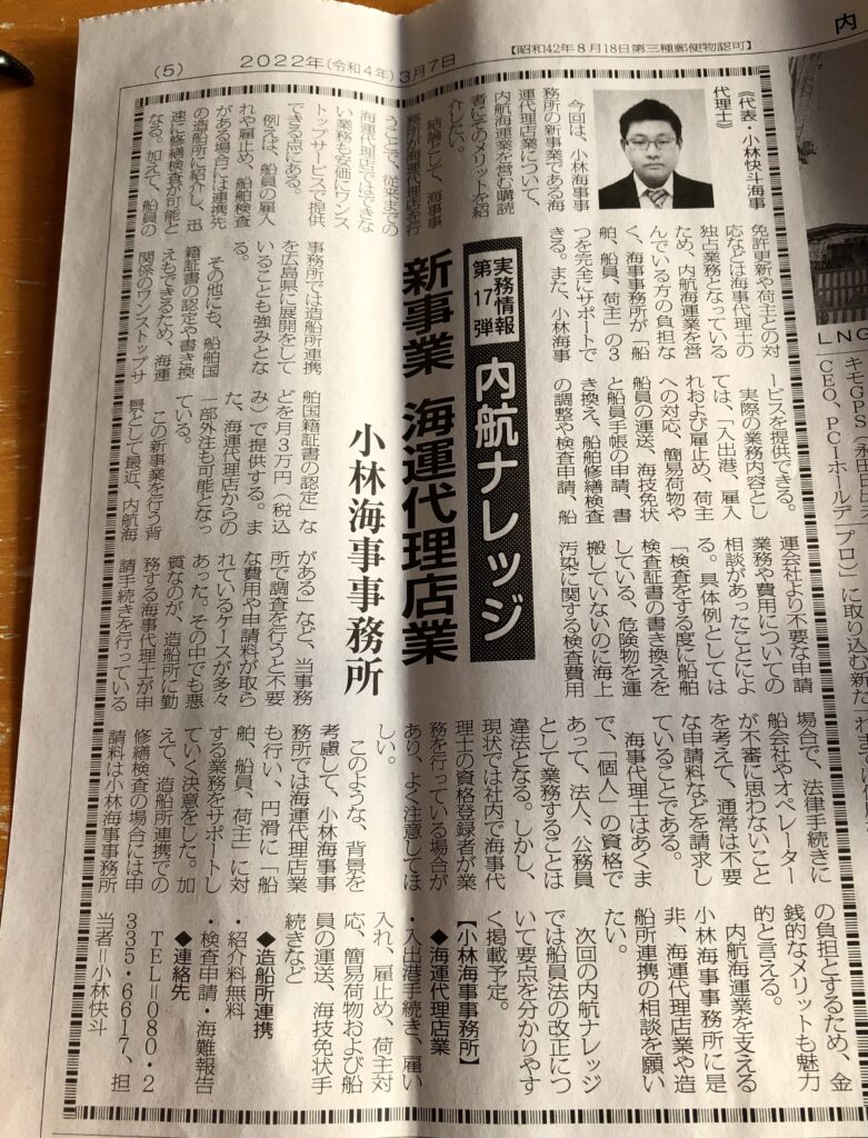 今回も当事務所の記事をご覧いただきありがとうございます! 3月7日付けで内航新聞社の内航海運新聞にて「内航ナレッジ」シリーズを掲載させていただきました。 海運代理店業について 本誌では小林海事事務所として海運代理店業の業務も行う内容となってい...